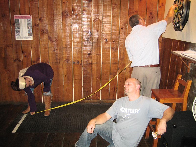 Dave enlists Sally to help measure the dartboard's alignment as he looks for reasons that he's getting beaten by Jez and me. We relax during this timeout as we know we're good to go